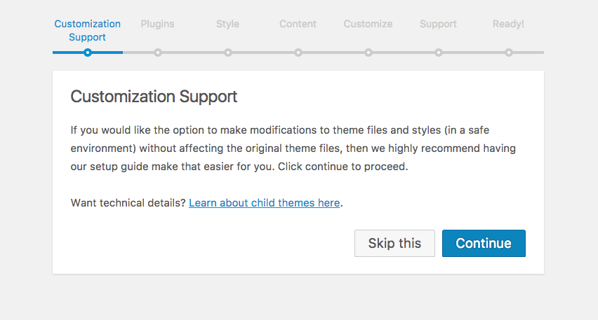 If you would like the option to make modifications to theme files and styles (in a safe environment) without affecting the original theme files, then we highly recommend having our setup guide make a child theme for you.