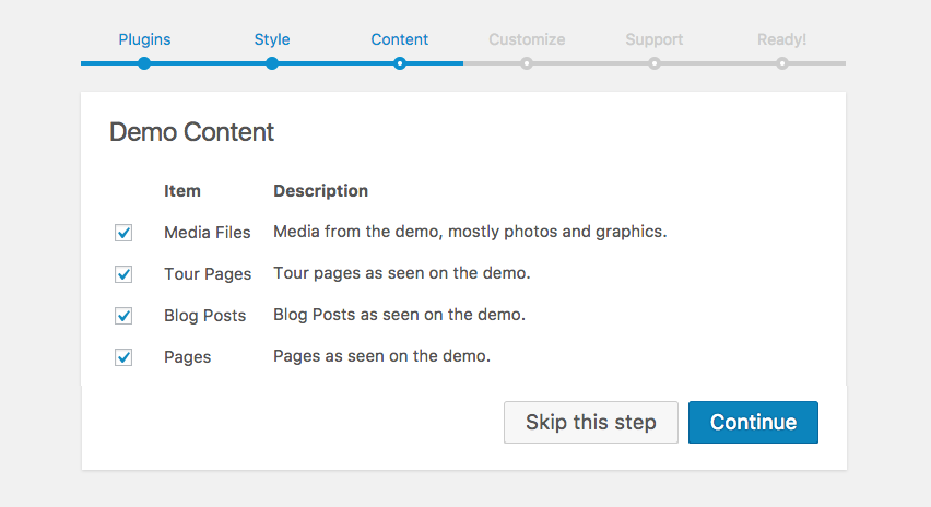 Getting started is easier with demo content. We recommend checking all boxes as you can always choose to remove content from within WordPress after setup.