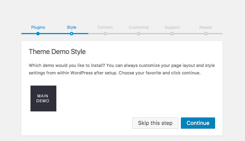 Which demo would you like to install? You can always customize your page layout and style settings from within WordPress after setup.